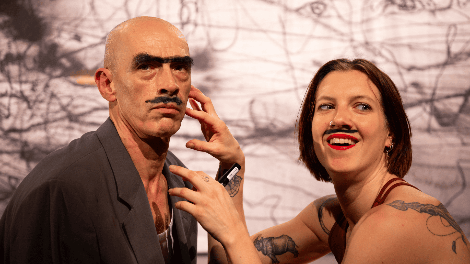 Ginger is the new show by Nevski Prospekt, written and performed by Ives Thuwis and Jotka Bauwens. Their special friendship is told through various interconnected scenes that culminate in a re-enactment of the iconic dance by Fred Astaire and Ginger Rogers. Ives with feathers, Jotka in a tuxedo.